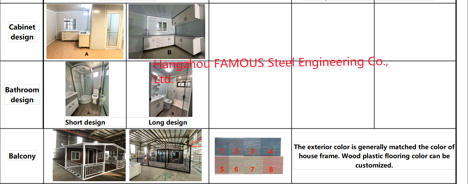 Advantage | (1) Fast installation: 2 hours/set, save labor cost; (2) Anti-rust: all material use hot galvanized steel; (3) Waterproof: without wood ceiling,wall; (4) Fireproof:Fire rating A grade (5) Simple foundation:just need 12pcs concrete block foundation; (6) Wind-resistant(11 level) and anti-seismic(9 grade) |